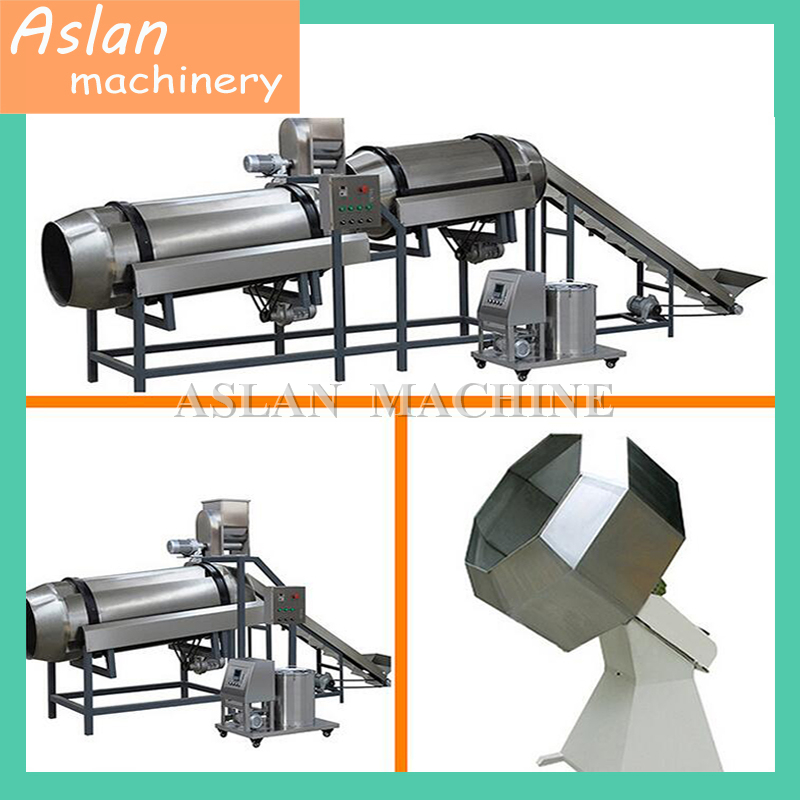 Continuous seasoning machine is suitable for food production process of food seasoning. Applicable to all kinds of puffed food, such as fries, potato chips and other taste.Food seasoning machine has a tilt-type seasoning roller, fully automatic control of the speed and material capacity, suitable for continuous seasoning seasoning operations.