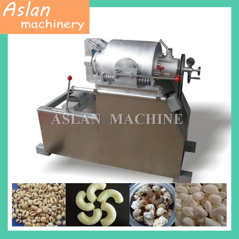 Working principle: Will certain materials into with cover sealing in the cast steel tanks, use liquefied petroleum gas, gas or coal to heat, and constantly rotating tanks at a certain speed, uniform heat of material, along with the continuous heating, tank temperature rise gradually, reaches above 100 ℃, material surface moisture in the body will escape and vaporization, certain pressure in the tank. When the material moisture is controlled about 5% ~ 8%, the internal pressure of the tank will reach 0.8-1.25 Mpa (different material pressure). Has basic cure, material of the tank at this time if the tank lid suddenly opened and released by high temperature and high pressure condition suddenly dropped to atmospheric pressure, the material of puff wheat puffing machine will be in the position of the water loss by air filled but bigger, its structure changes, raw starch starch (beta) become mature (alpha starch), volume) several times to ten times. At the moment of release, the airflow and materials of the extruder are immediately expanded and the air is sharply torn apart, producing a loud noise that reaches around 100 decibels.