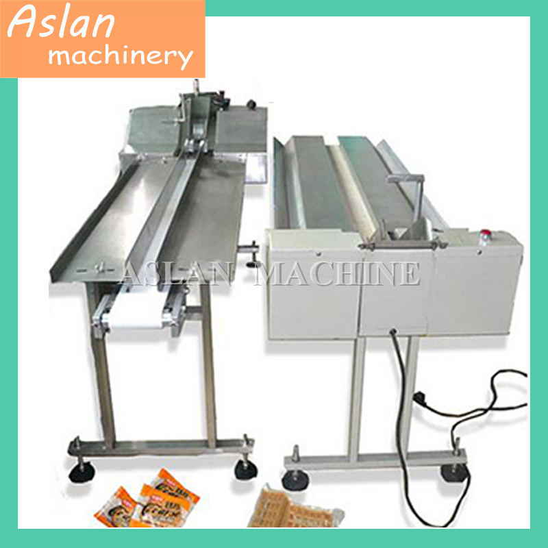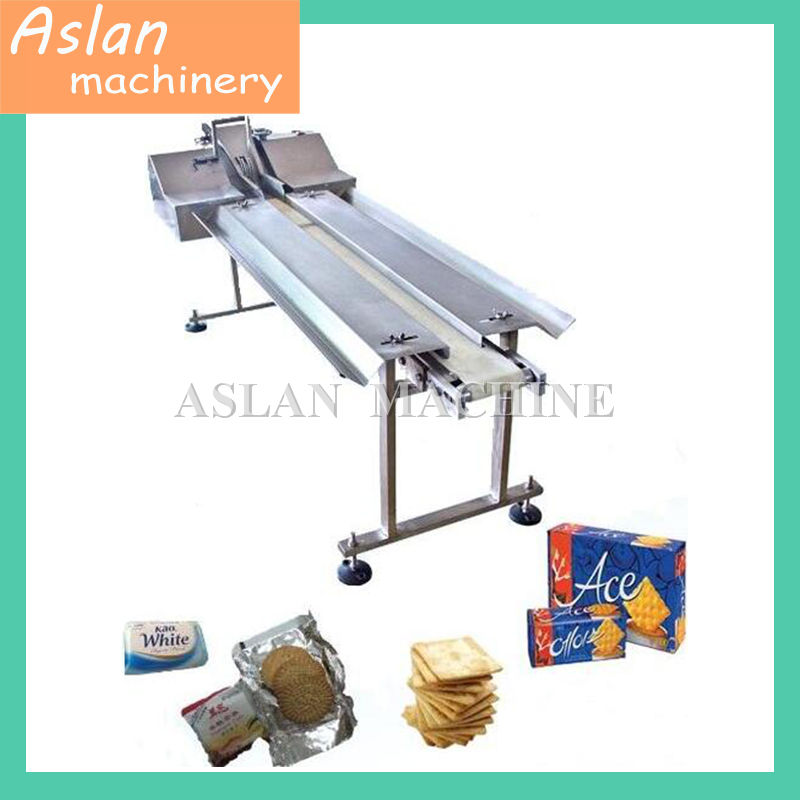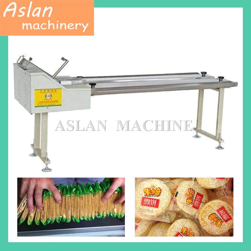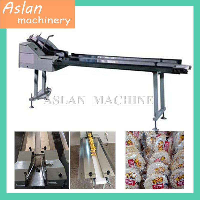 This machine can work with pillow packing machine , it is mainly used to tidy packages after packing to make them in order , then put them into paper carton . It can packages including biscuit, sweets, moon cake, candy, soap, etc.